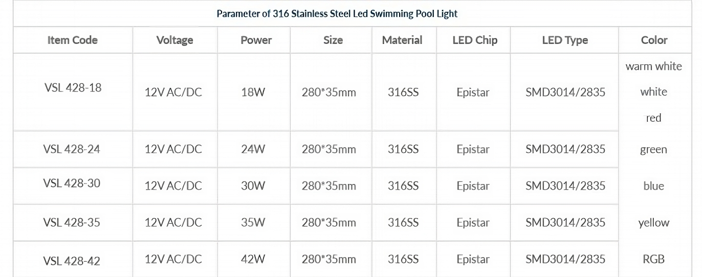 Parameter of 316 Stainless Steel Led Swimming Pool Light