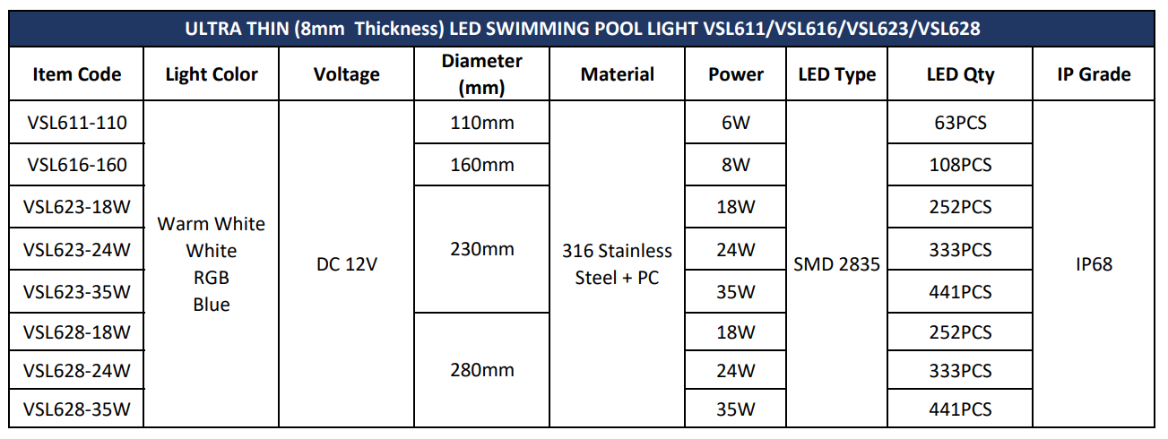 ULTRA THIN (8MM THICKNESS) LED SWIMMING POOL LIGHT VSL 611/VSL 616/VSL 623/VSL 628
