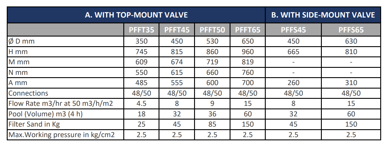 - PFFT/VPFT filters are available in diameter from 350mm to 900mm, therefore can be installed in small and large private pools.